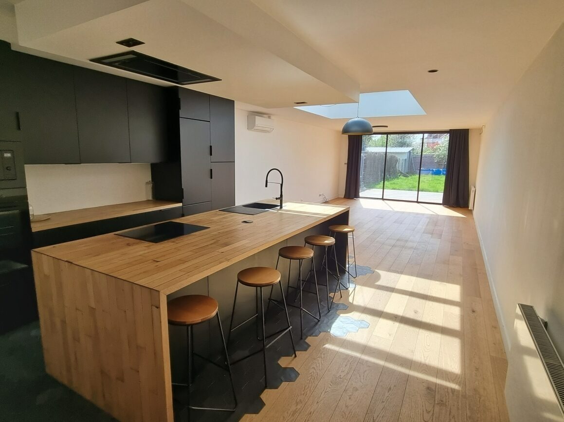 Cette superbe maison de +/- 120 m2 habitables construite en 2021 sur une parcelle de 206 m2, vous propose au rez-de-chaussée une superbe cuisine entièrement équipée ouverte sur le séjour très lumineux et parqueté (ensemble de +/- 50m2), une belle buanderie et un garage avec porte motorisée.