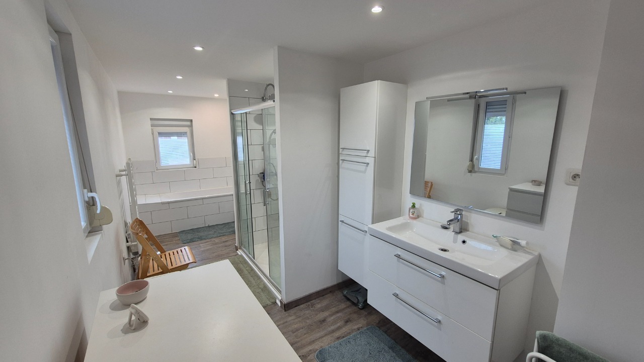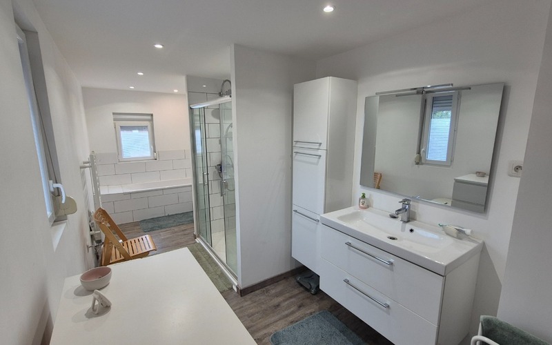 Au 1er étage vous trouverez 2 chambres non passantes et la superbe salle de bain très pratique car elle dispose d'une grande douche, d'une baignoire , d'une grande vasque et d'un WC.